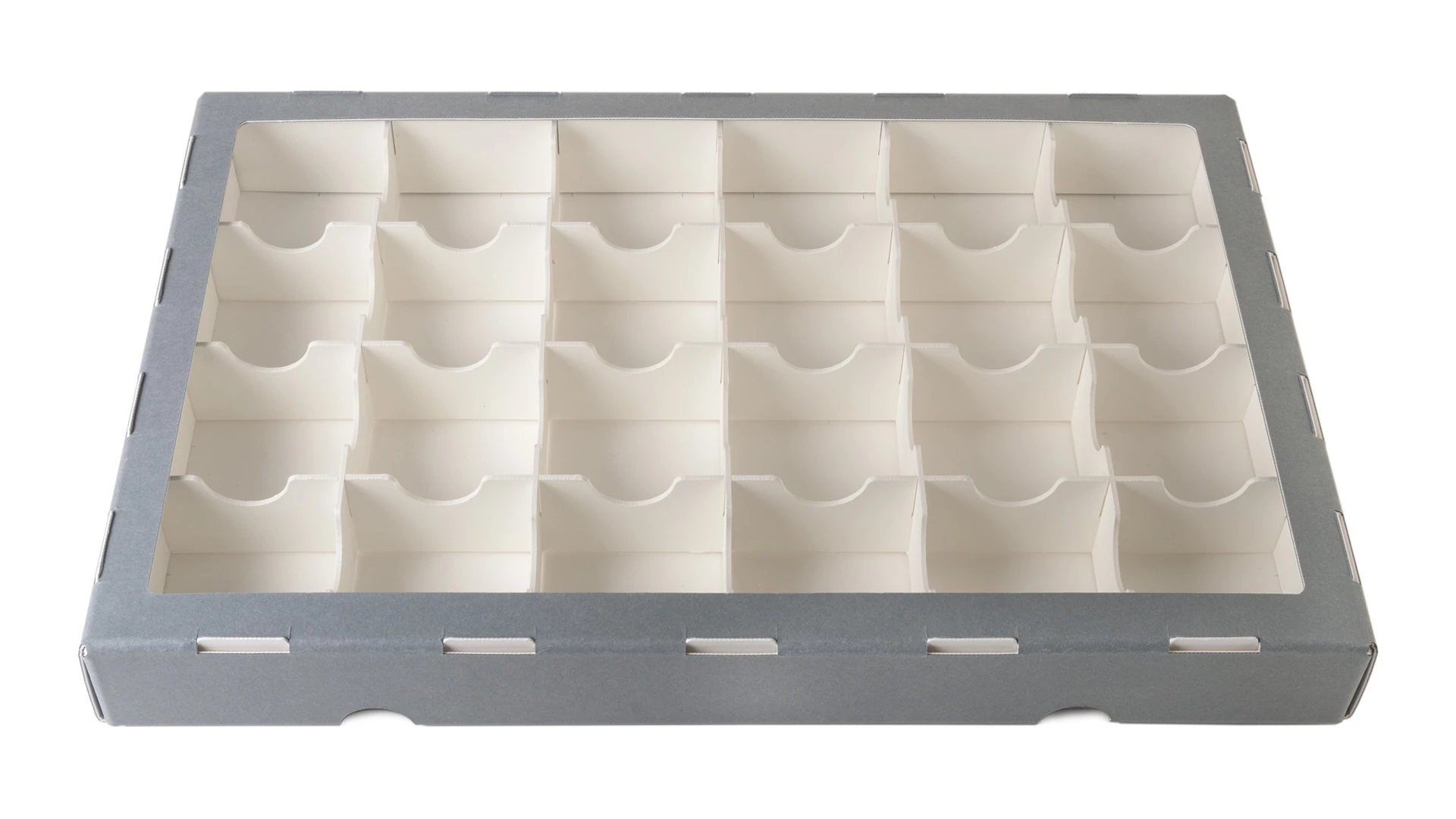 A rekeszes doboz elsősorban kisebb múzeumi tárgyak és fényképészeti anyagok tárolására szolgál. Ez a konstrukció leggyakrabban fedeles doboz, amelynek belső válaszfalai vastag és merev, múzeumi minőségű kartonból készülnek (ISO 9706, PAT). Egy másik változatban a válaszfalak ("A" típus) ugyanabból a kartonból készülnek, amelyből a külső doboz is készült.