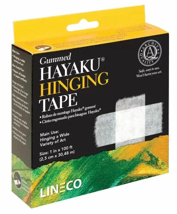 A Hayaku egy japán eperfa papír, amely savmentes, vízzel aktivált ragasztóval van bevonva. Ez a rendkívül erős, hosszú szálú zsanéros anyag időt és pénzt takarít meg Önnek. A papírra készült műalkotások zsanérozására, papírjavításra és szerkezeti erősítésre használják a művészetben, könyvkötészetben, valamint emléktárgyak konzerválására. A professzionális képkeretezők kedvence - a ragasztó erősen szárad és nem kúszik. Vízzel könnyen visszaszedhető. Az eltávolításhoz annyi vizet kell felvinni, hogy a szalag telítődjön vele. Várjon türelmesen, amíg a víz behatol a papírba és a ragasztóba. Távolítsa el és tisztítsa meg a ragasztómaradványokat vízzel.